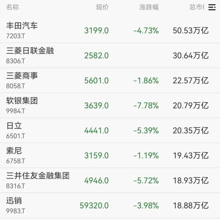 个股方面,软银集团一度跌超8%,丰田汽车、三菱日联金融、日立等均跌超4%。