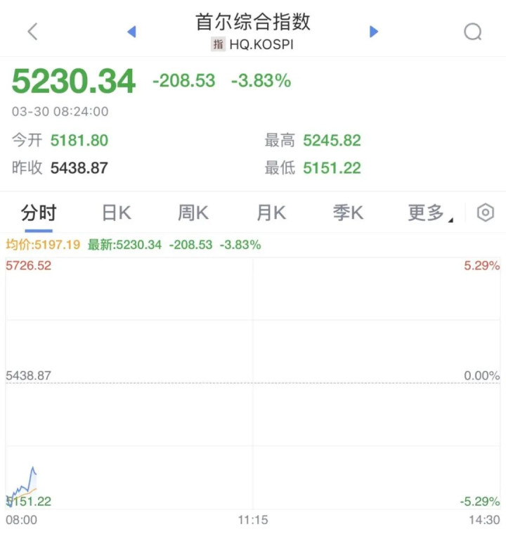韩国股市开盘大跌,韩国KOSPI指数跌幅一度扩大至5%,随后震荡调整。