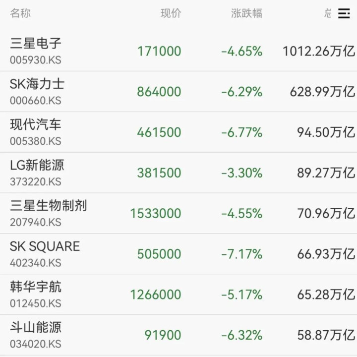 权重股方面,SK海力士、现代汽车、斗山能源等均跌超6%。